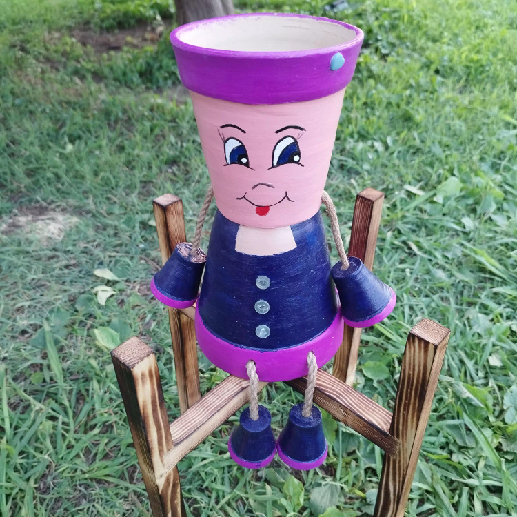 گلدان سفالی عروسکی ساخته شده از شش گلدان متصل به هم و در انتها یک لایه لاک ضد آب برای طول عمر بالای و ماندگاری گلدان بر روی کار استفاده شده است